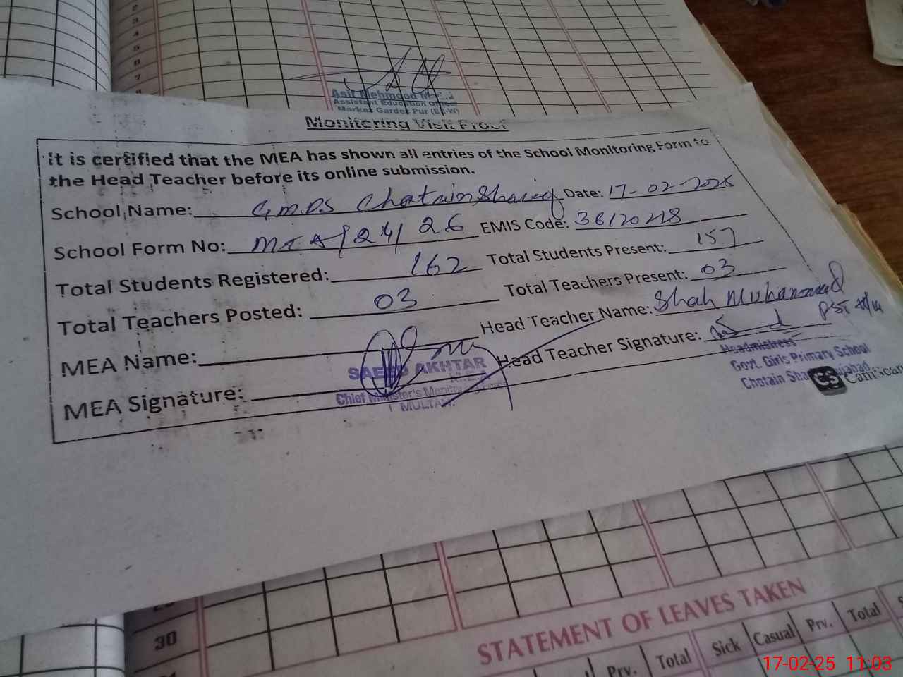 | Attendance Register | Head Teacher | MEA with School | Visit Proof |