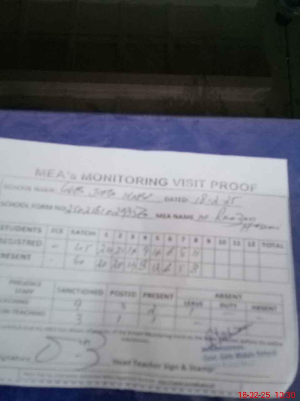 | Attendance Register | Head Teacher | MEA with School | Visit Proof |