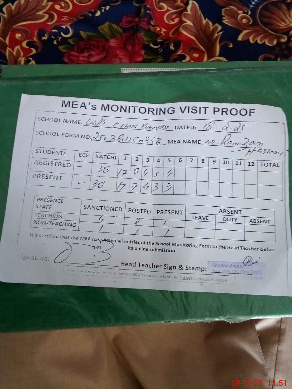 | Attendance Register | Head Teacher | MEA with School | Visit Proof |