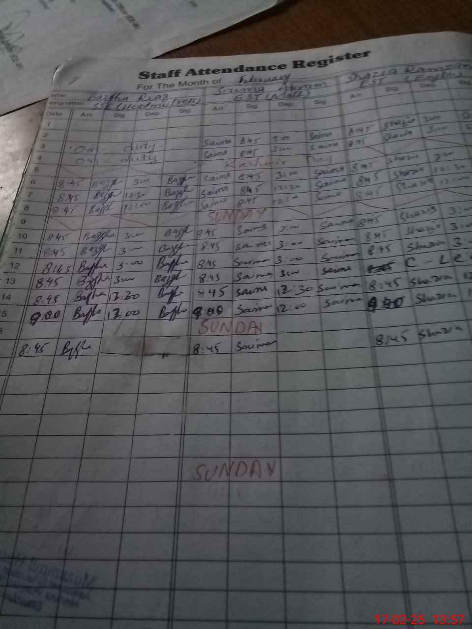 | CNIC | Full Name | Designation | R/C | Absence During Last Calender Month |