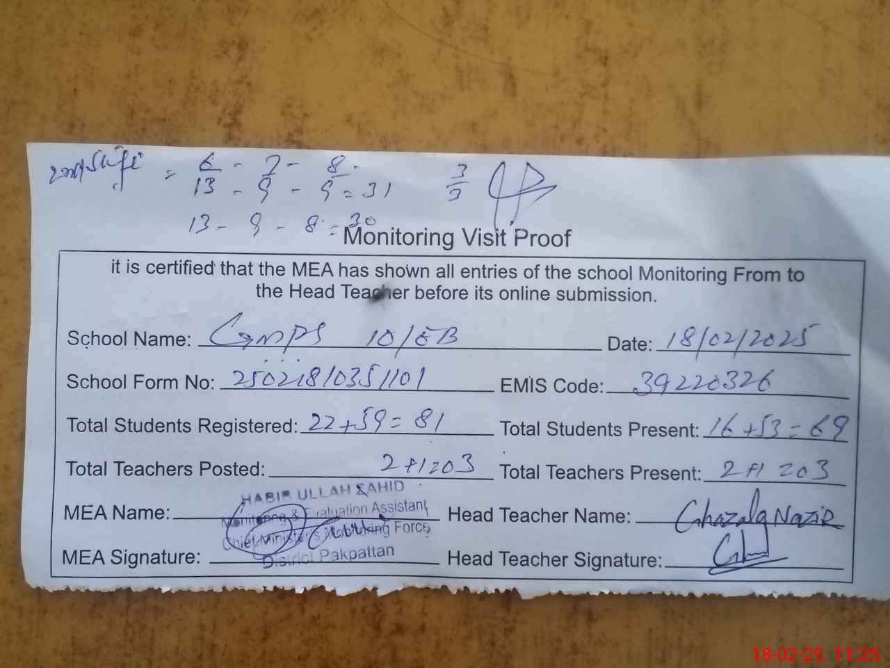 | Certified that this School was Inspected by the Undersigned MEA/DMO Today and the Information Stated Above is as Per Record. | |||||