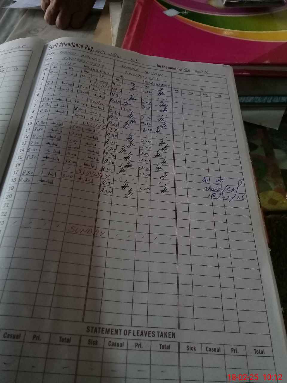 | CNIC | Full Name | Designation | R/C | Absence During Last Calender Month |