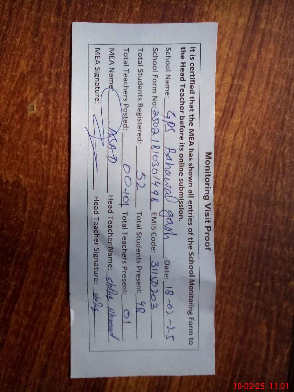 | Attendance Register | Head Teacher | MEA with School | Visit Proof |
