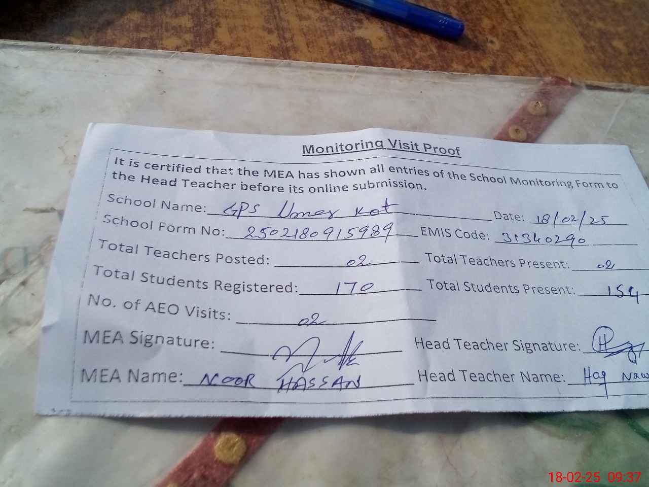| Attendance Register | Head Teacher | MEA with School | Visit Proof |