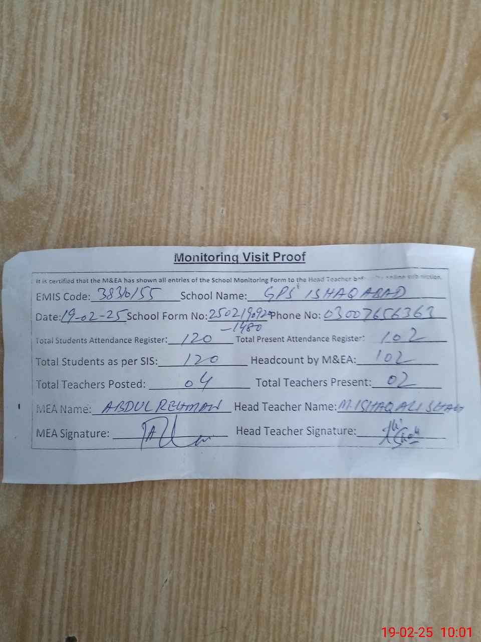 | EMIS Code: 38310155 | Name of School: GPS ISHAQ ABAD | |||