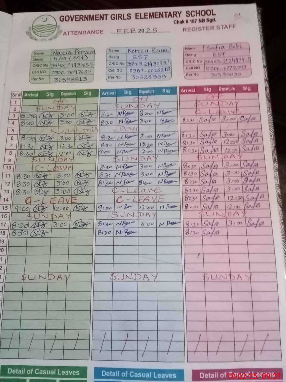 | CNIC | Full Name | Designation | R/C | Absence during last cal. month |