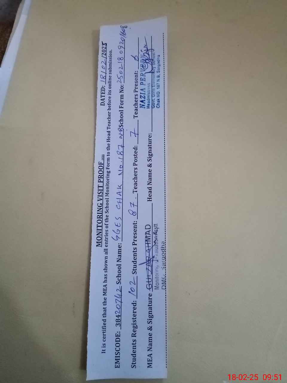 | Certified that this School was Inspected by the Undersigned MEA/DMO Today and the Information Stated Above is as Per Record. | |||||