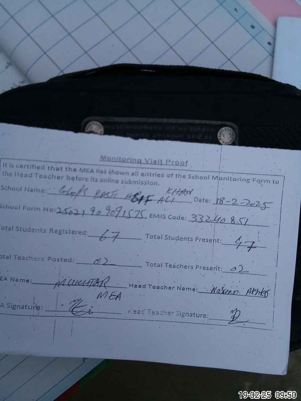 | Attendance Register | Head Teacher | MEA with School | Visit Proof |