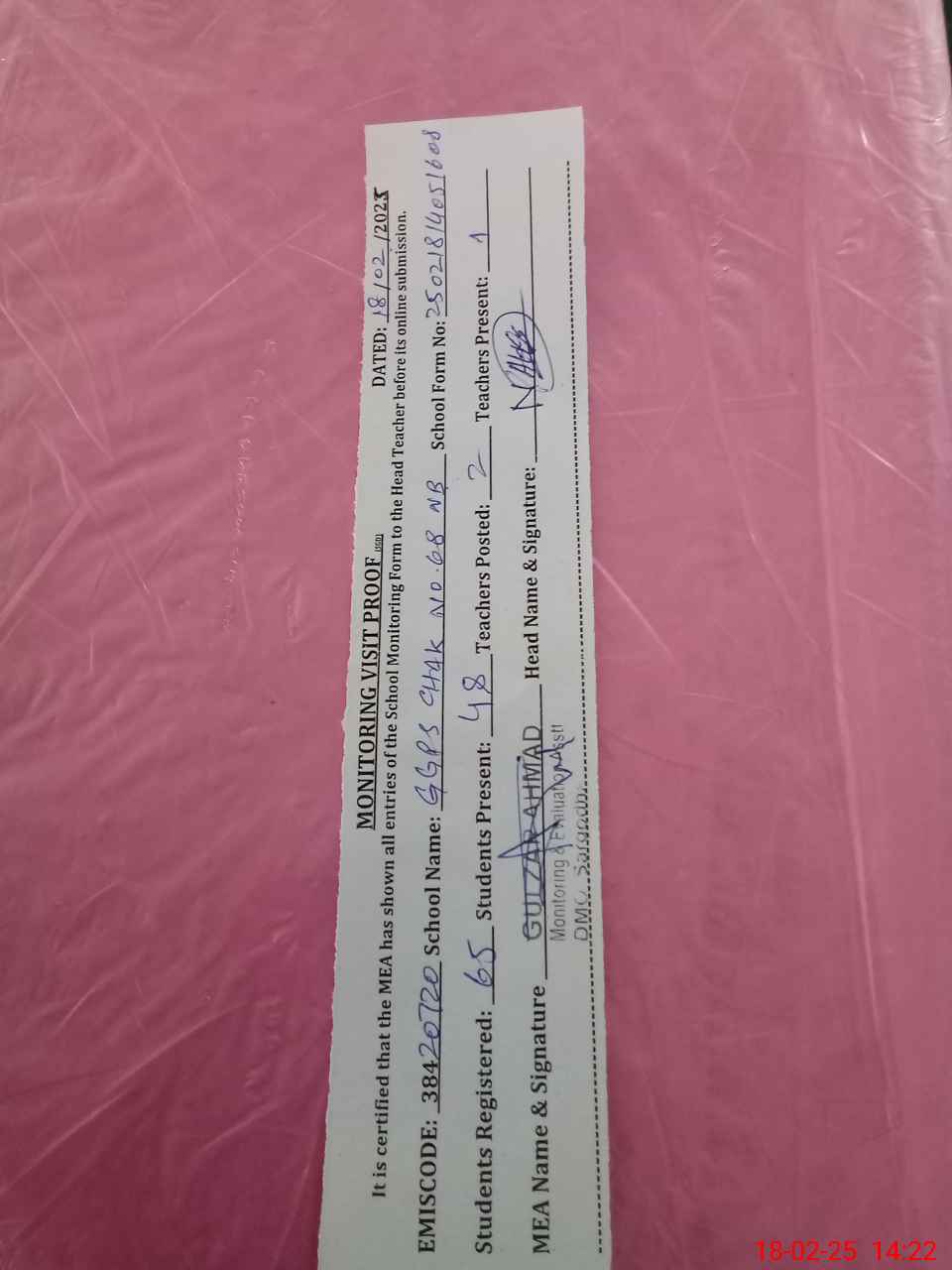 | Certified that this School was Inspected by the Undersigned MEA/DMO Today and the Information Stated Above is as Per Record. | |||||