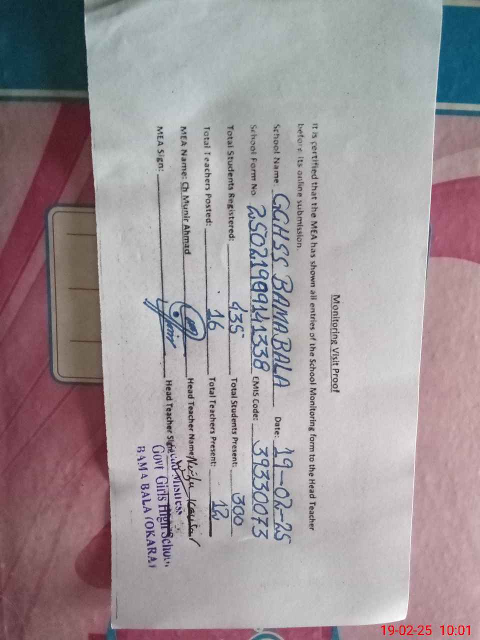 | Certified that this School was Inspected by the Undersigned MEA/DMO Today and the Information Stated Above is as Per Record. | |||||