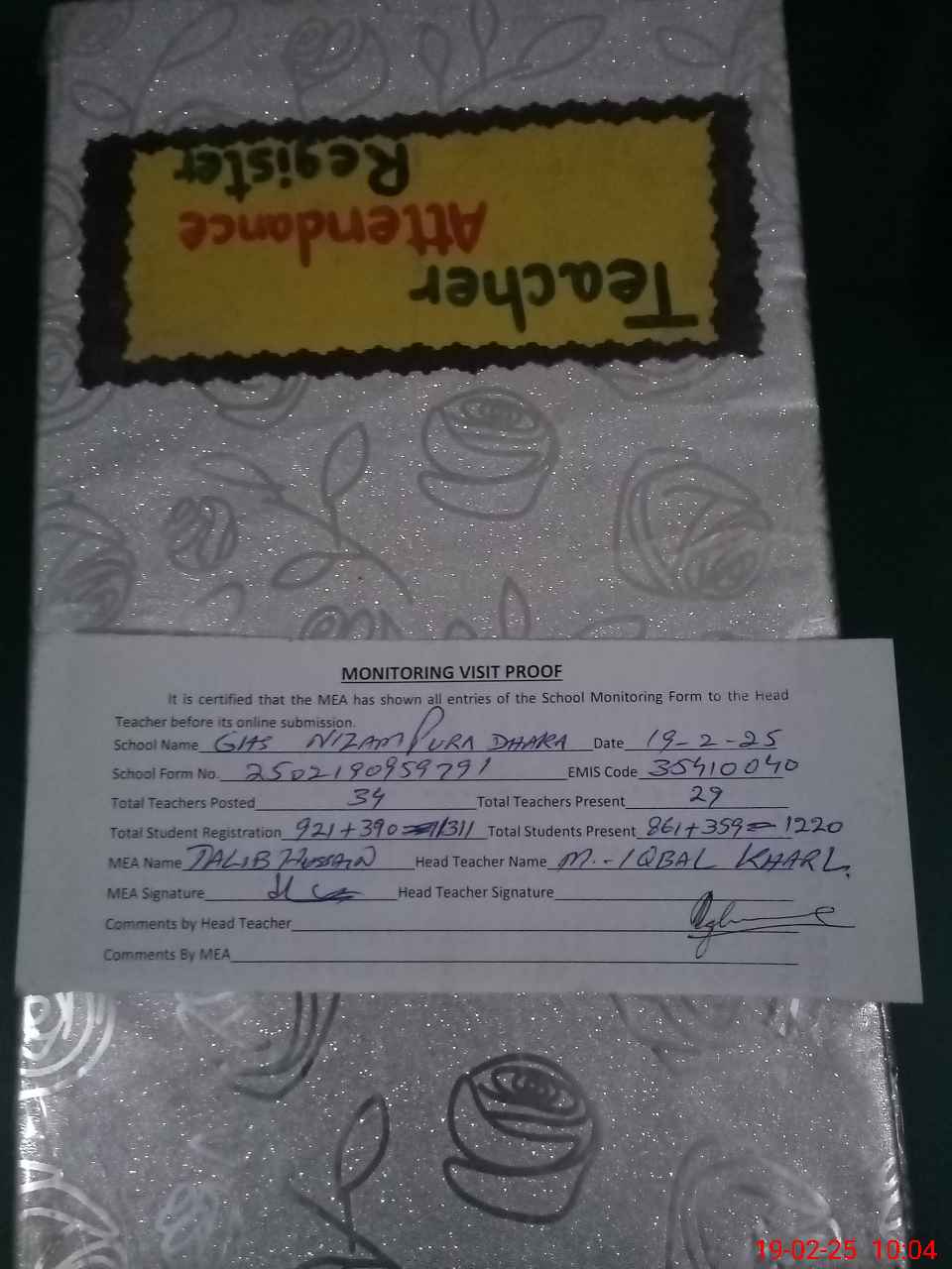 | Attendance Register | Head Teacher | MEA with School | Visit Proof |