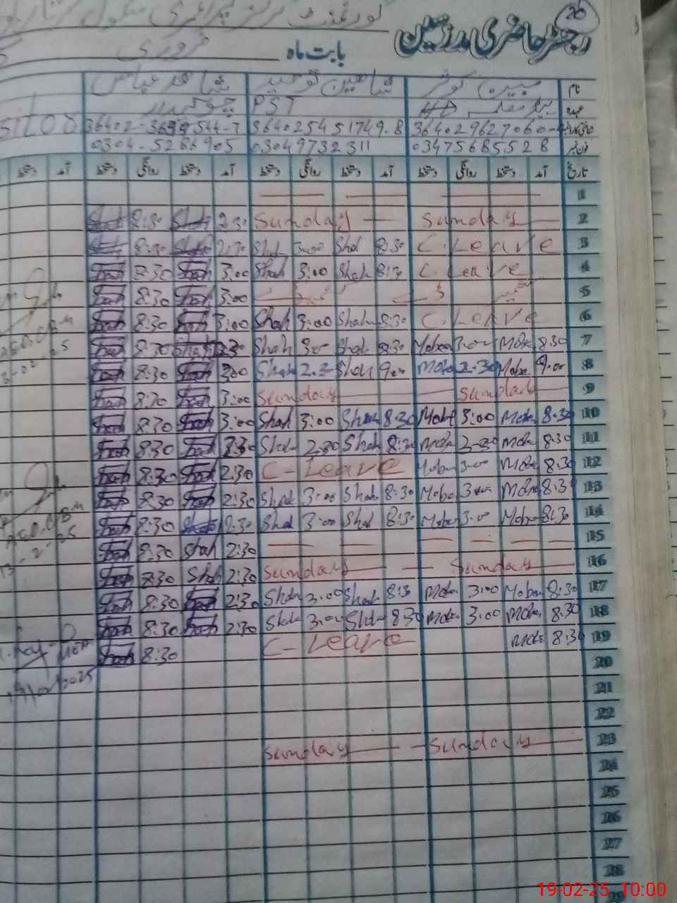 | CNIC | Full Name | Designation | R/C | Absence During Last Calender Month |