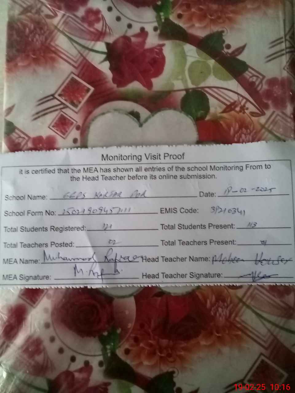 | Attendance Register | Head Teacher | MEA with School | Visit Proof |