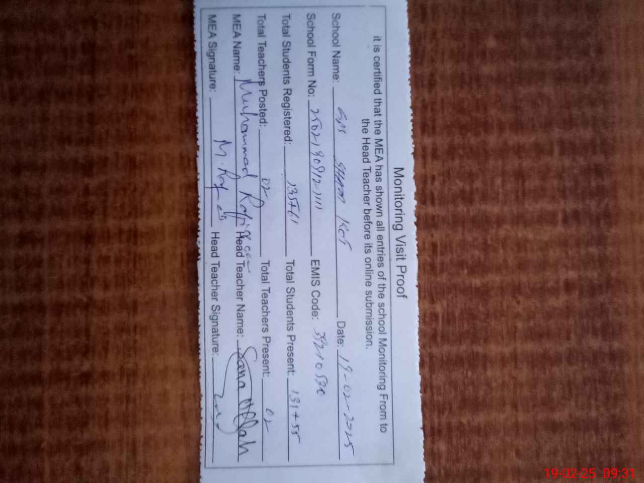 | Attendance Register | Head Teacher | MEA with School | Visit Proof |