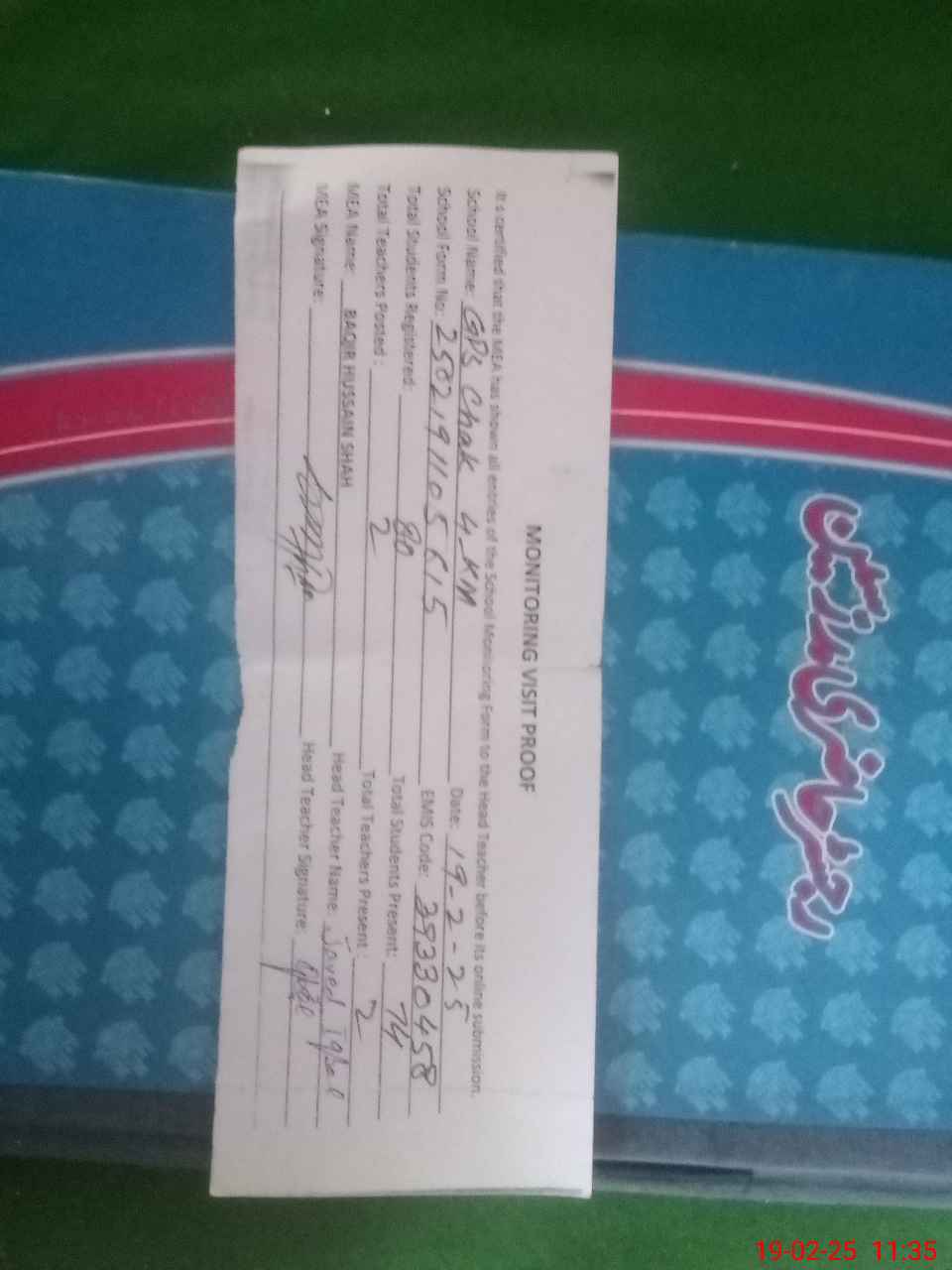 | Attendance Register | Head Teacher | MEA with School | Visit Proof |