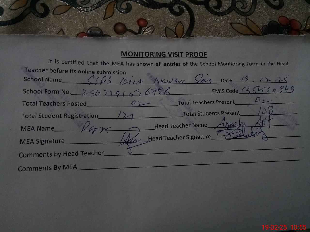 | Certified that this School was Inspected by the Undersigned MEA/DMO Today and the Information Stated Above is as Per Record. | |||||