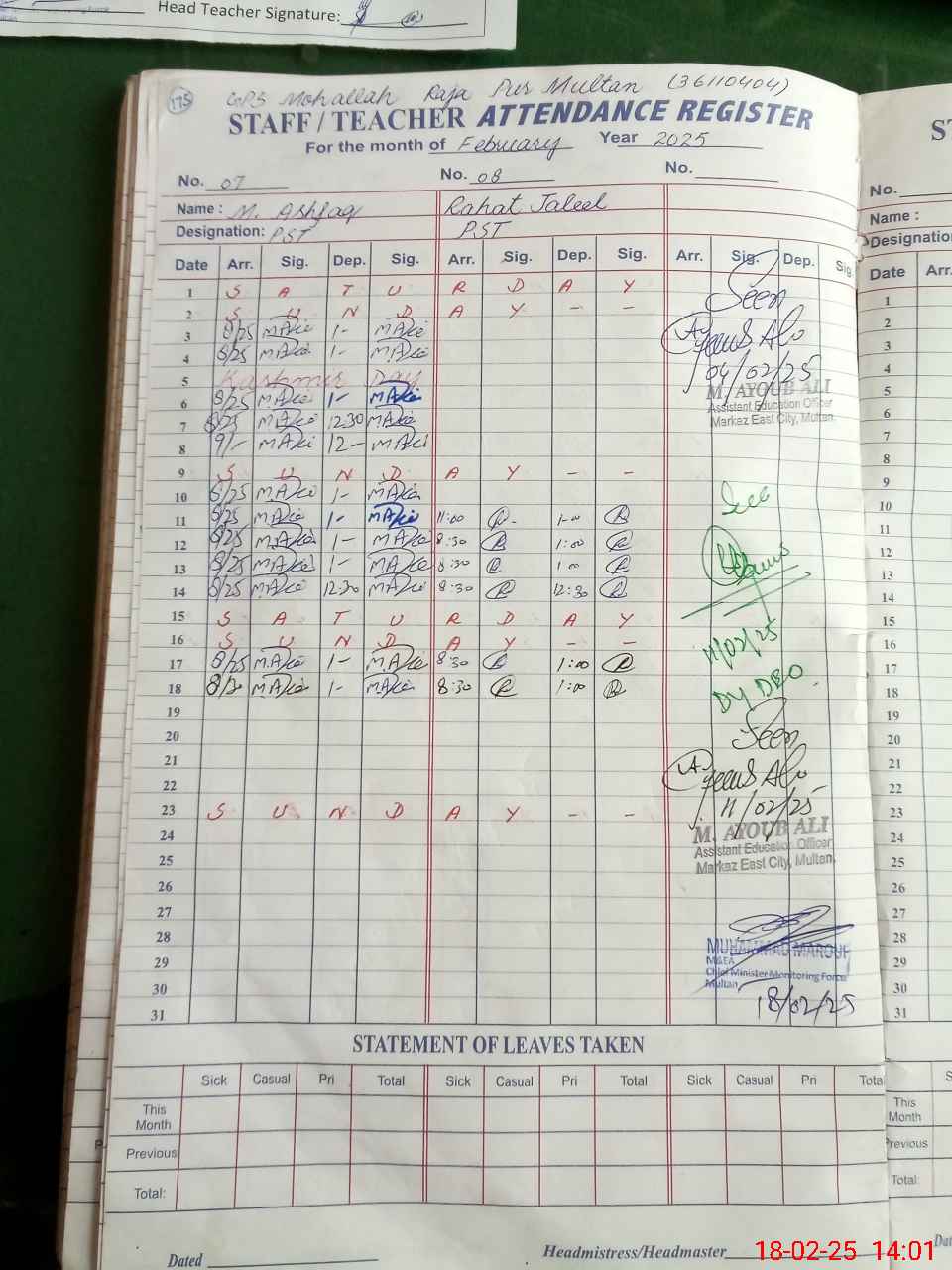 | Attendance Register | Head Teacher | MEA with School | Visit Proof |
