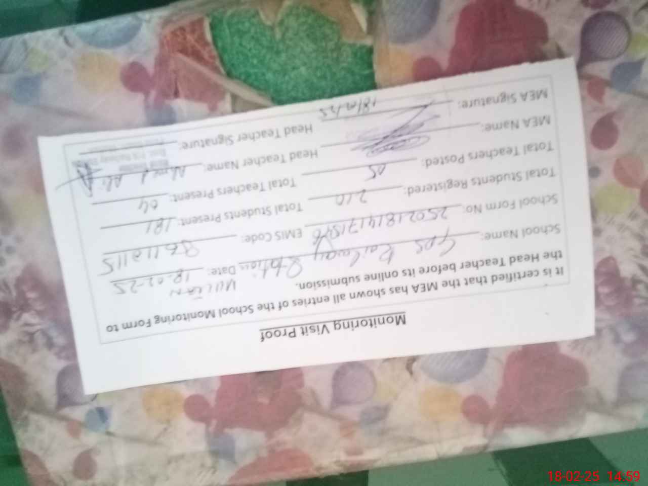 | Attendance Register | Head Teacher | MEA with School | Visit Proof |
