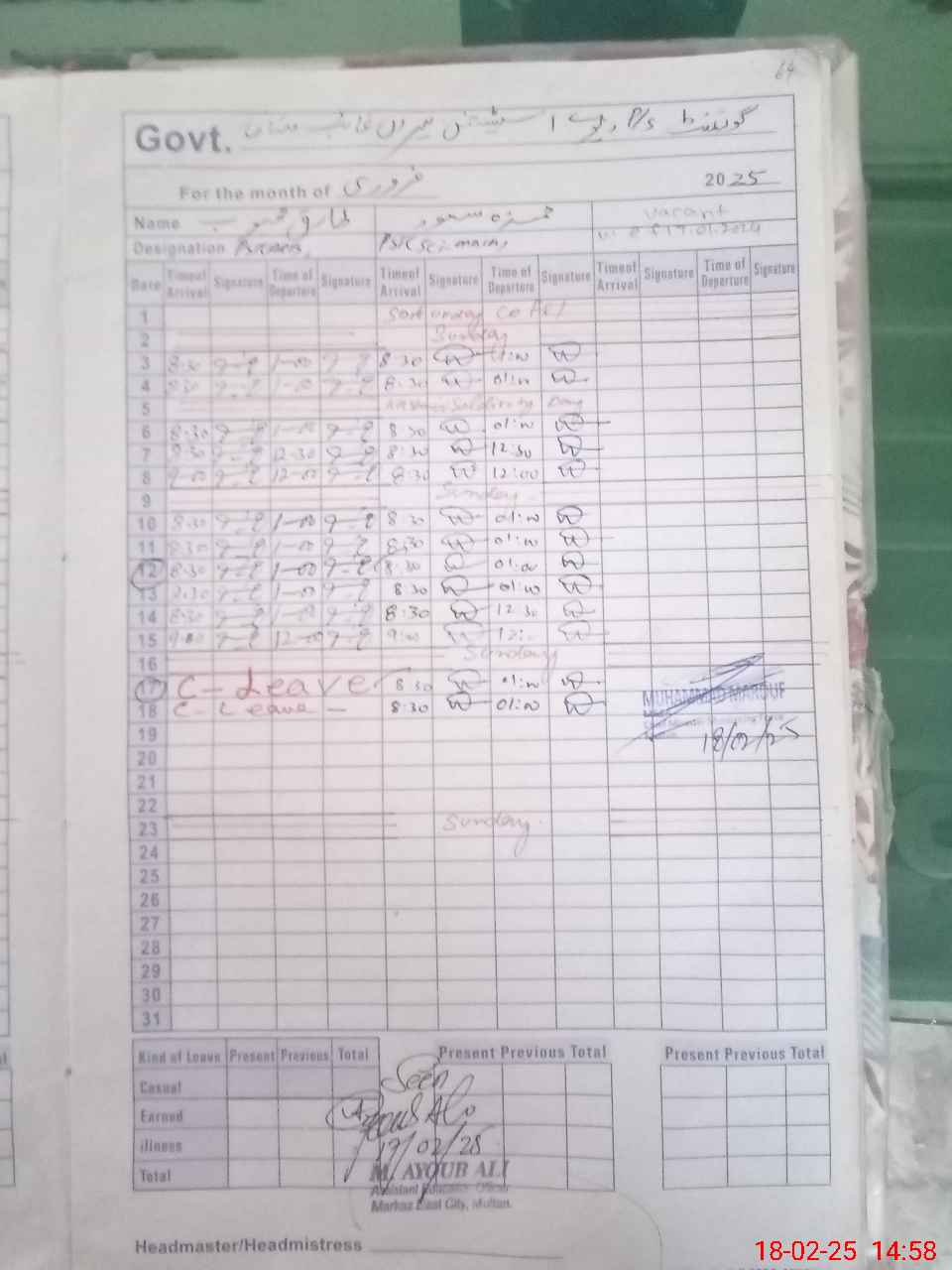 | Remarks (Use Separate Page if Required): 01 room under construction since Jan 23 insaff school so morning students present status taken from Rosnamcha today After noon 02 teachers on leave | |||||