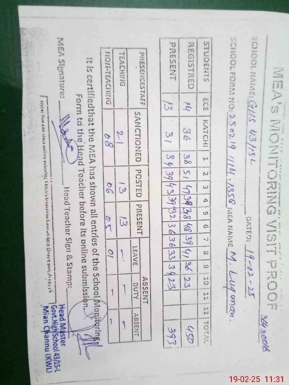 | EMIS Code: 36430016 | Name of School: GHS 43/15-L, MIAN CHANNU | |||