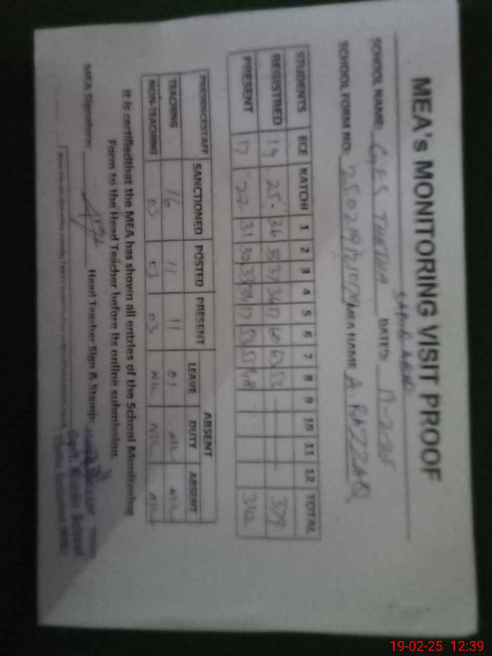 | Attendance Register | Head Teacher | MEA with School | Visit Proof |