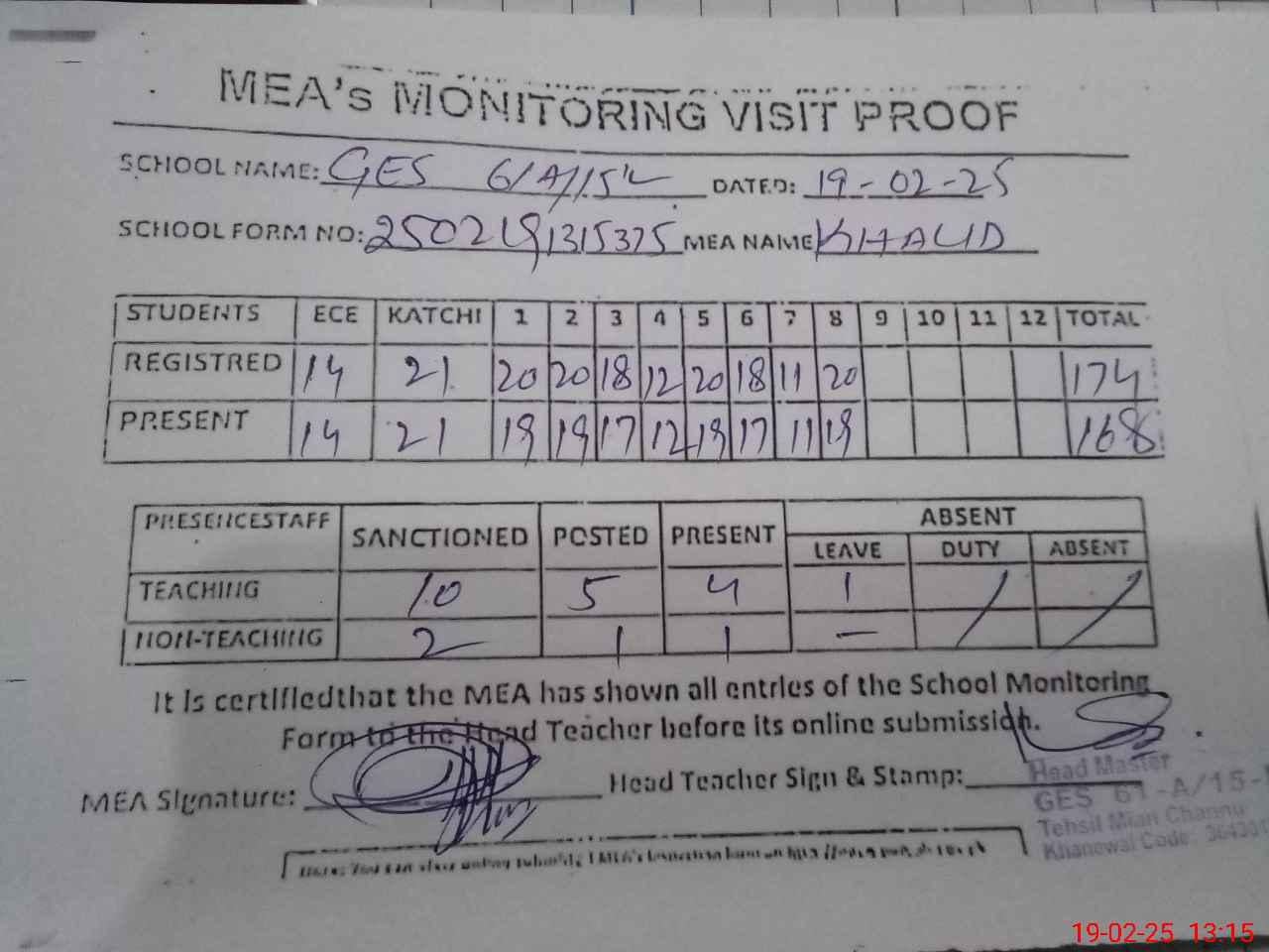 | Attendance Register | Head Teacher | MEA with School | Visit Proof |