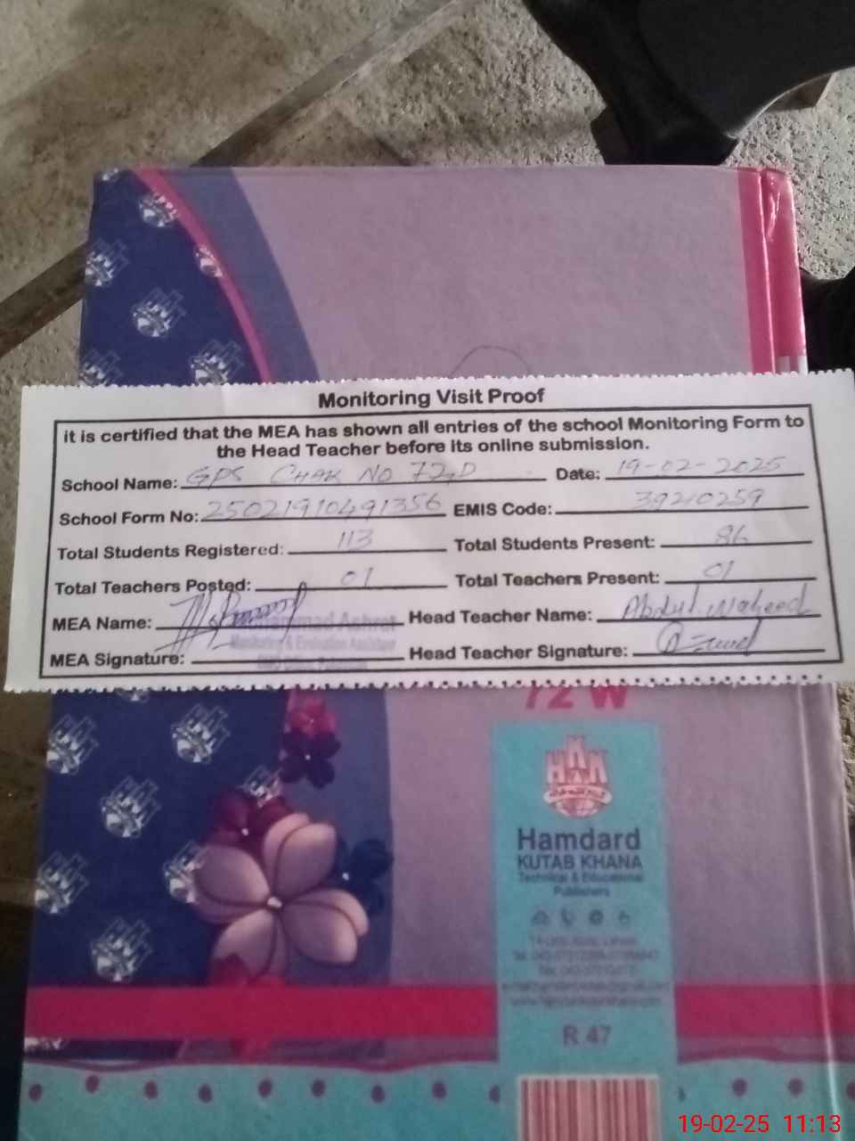 | EMIS Code: 39210259 | Name of School: GPS CHAK NO. 72 D | |||