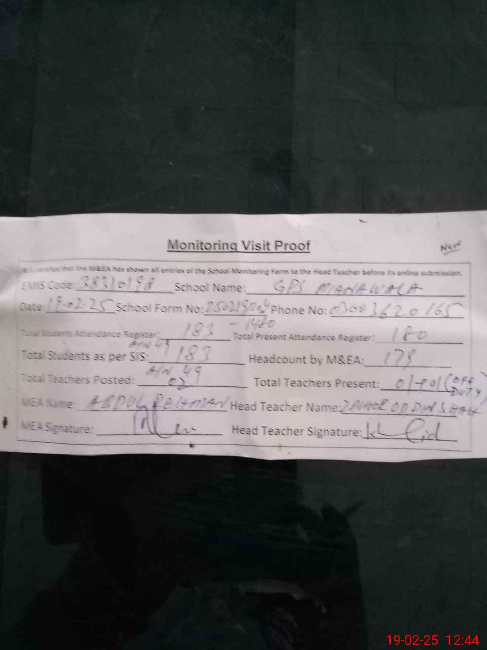 | Attendance Register | Head Teacher | MEA with School | Visit Proof |