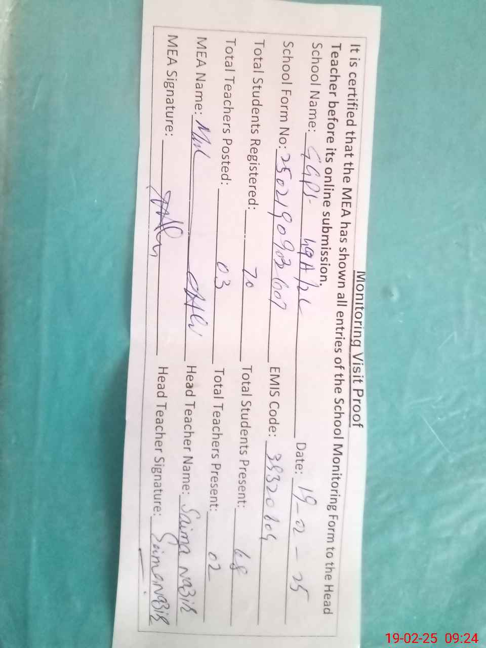 | Attendance Register | Head Teacher | MEA with School | Visit Proof |