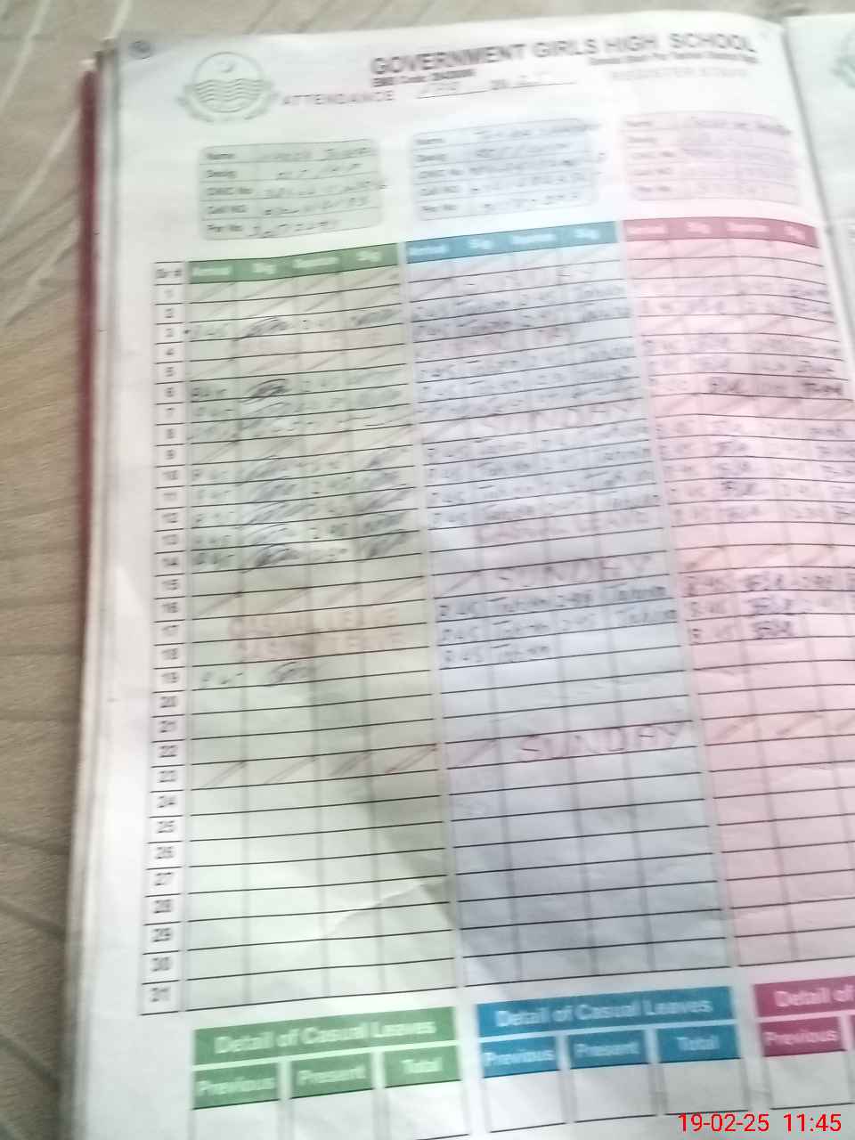 | CNIC | Full Name | Designation | R/C | Absence During Last Calender Month |