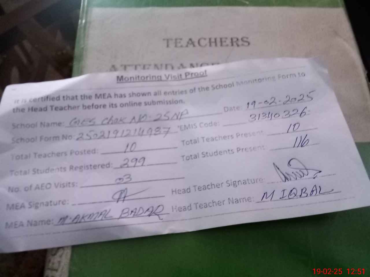 | Attendance Register | Head Teacher | MEA with School | Visit Proof |