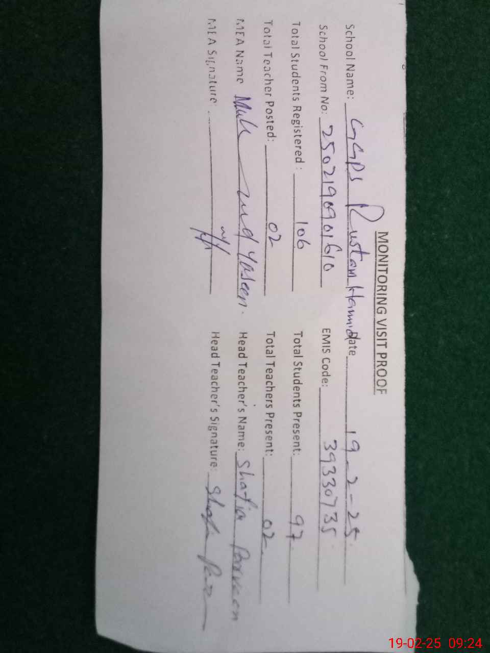| Attendance Register | Head Teacher | MEA with School | Visit Proof |