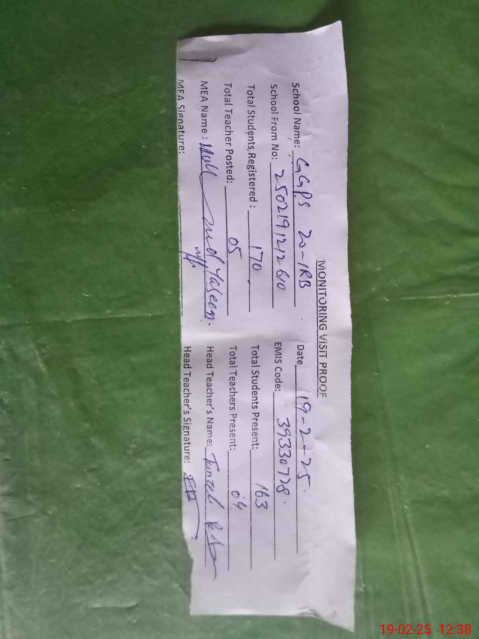 | Attendance Register | Head Teacher | MEA with School | Visit Proof |