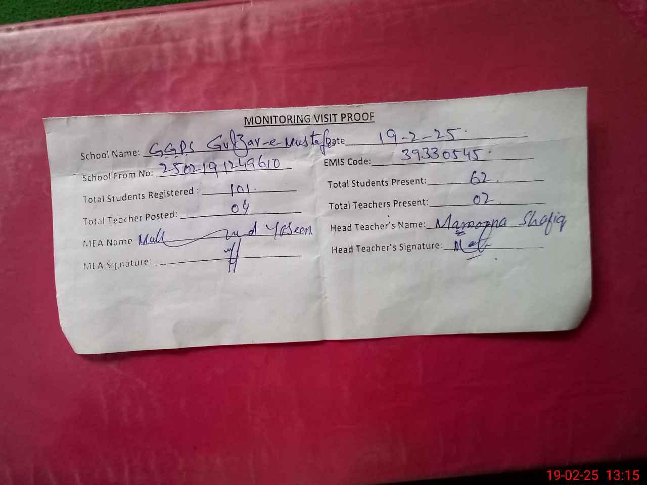| Attendance Register | Head Teacher | MEA with School | Visit Proof |