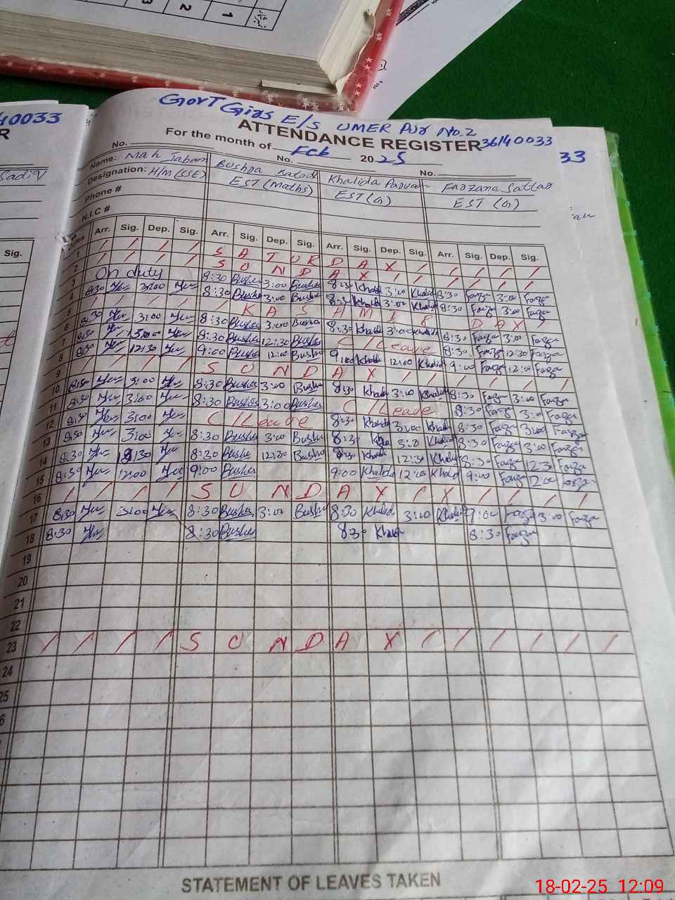 | CNIC | Full Name | Designation | R/C | Absence During Last Calender Month |