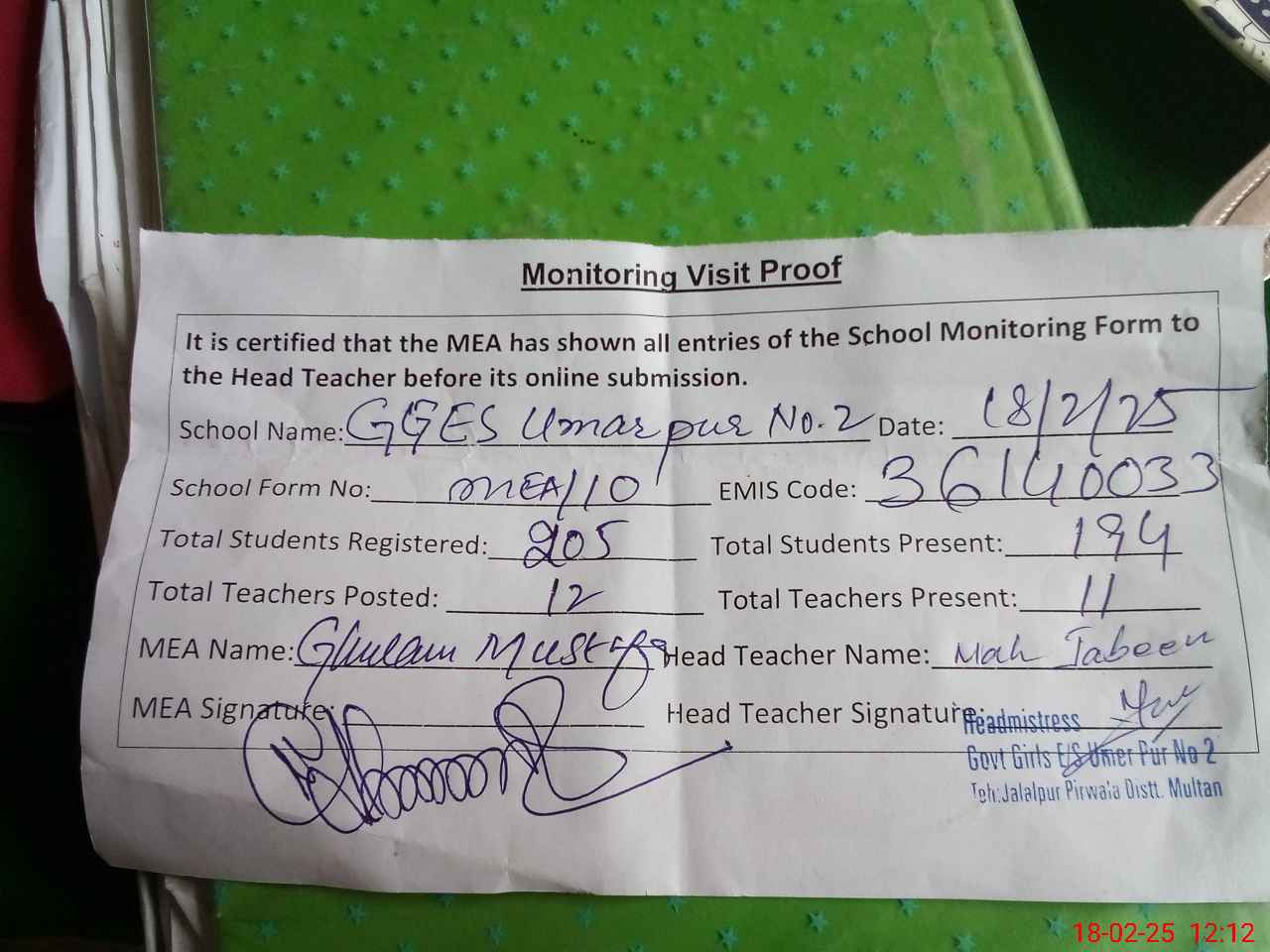 | Attendance Register | Head Teacher | MEA with School | Visit Proof |