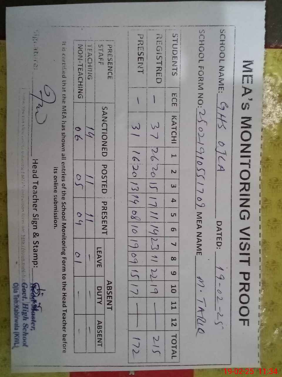| Attendance Register | Head Teacher | MEA with School | Visit Proof |