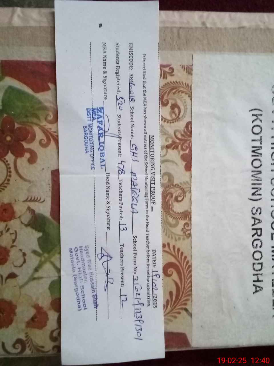 | Certified that this School was Inspected by the Undersigned MEA/DMO Today and the Information Stated Above is as Per Record. | |||||