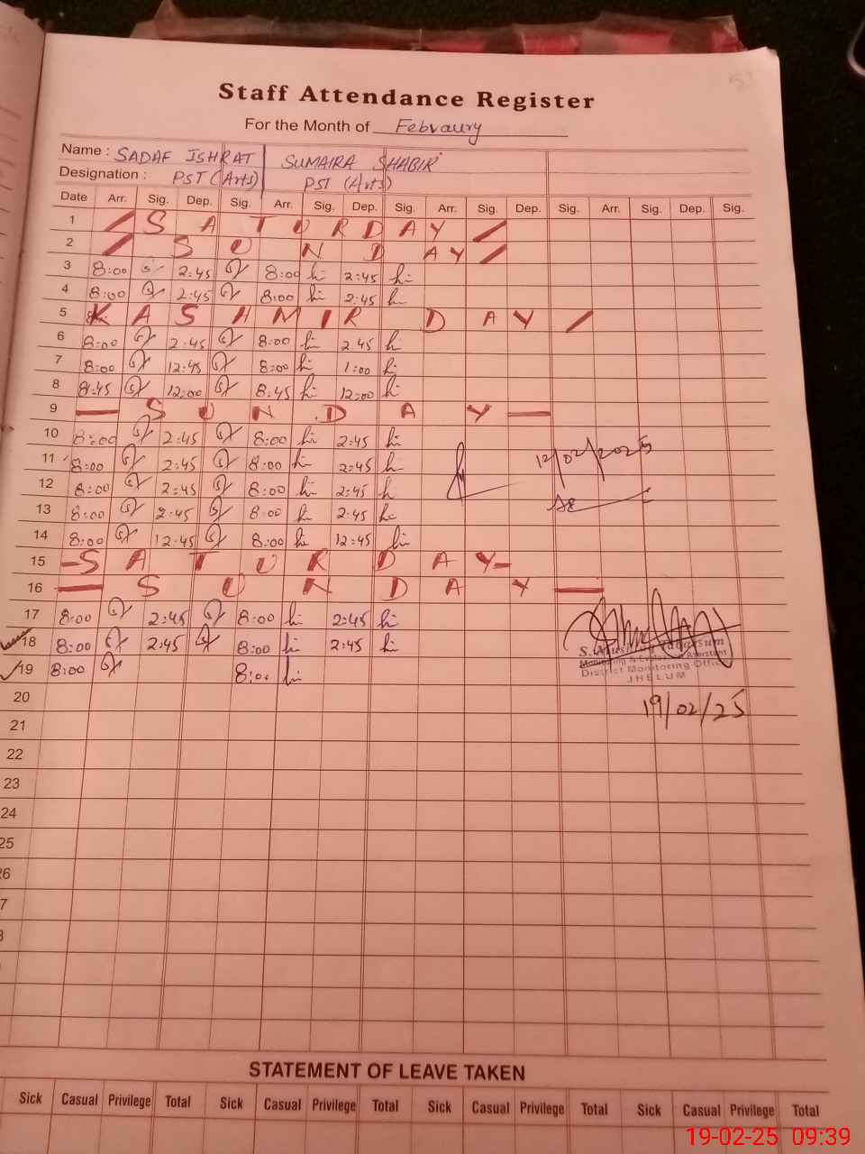 | Monitoring Date: 19-02-2025 | Start Time: 19-02-2025 09:15 AM | End Time: 19-02-2025 09:41 AM | Name of MEA: Sh**** Mu**** Ta**** | |