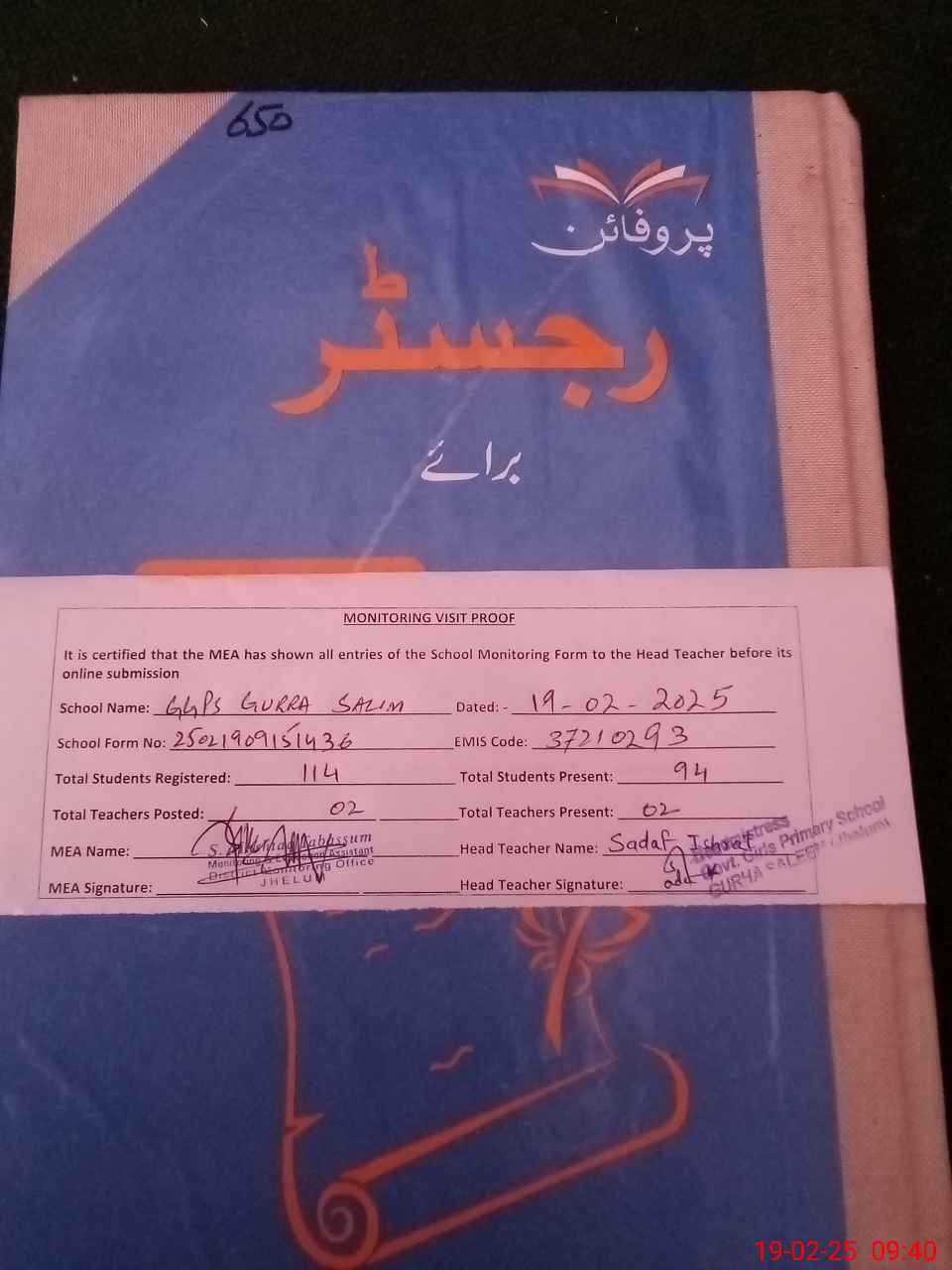 | Attendance Register | Head Teacher | MEA with School | Visit Proof |