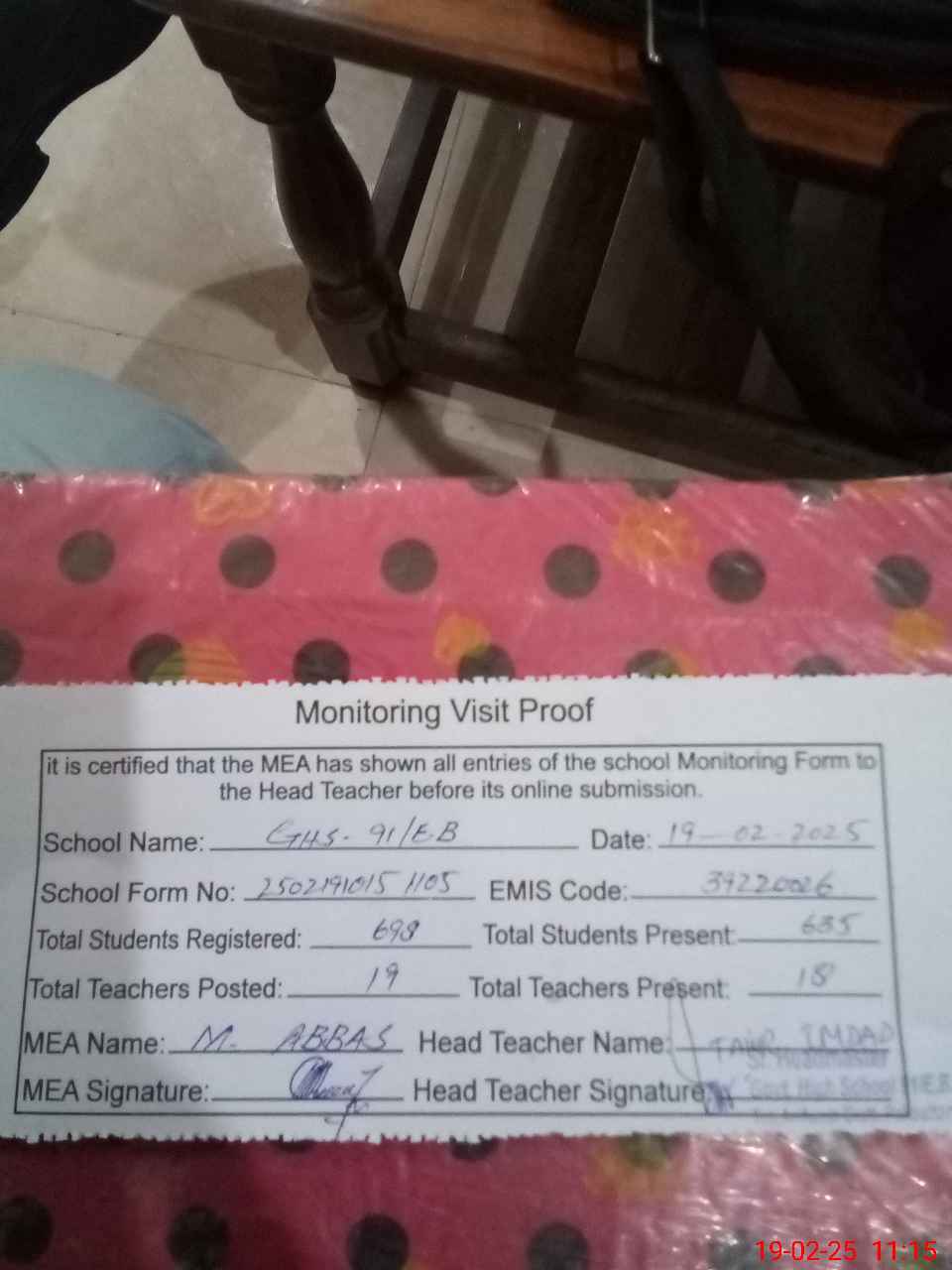 | Certified that this School was Inspected by the Undersigned MEA/DMO Today and the Information Stated Above is as Per Record. | |||||