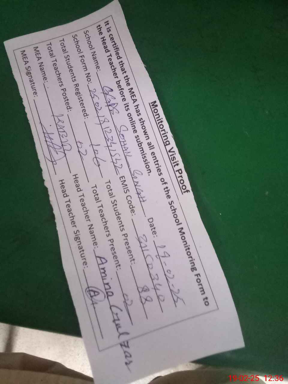 | Attendance Register | Head Teacher | MEA with School | Visit Proof |