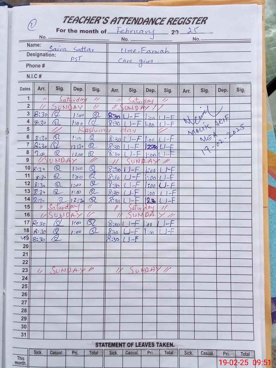 | CNIC | Full Name | Designation | R/C | Absence During Last Calender Month |