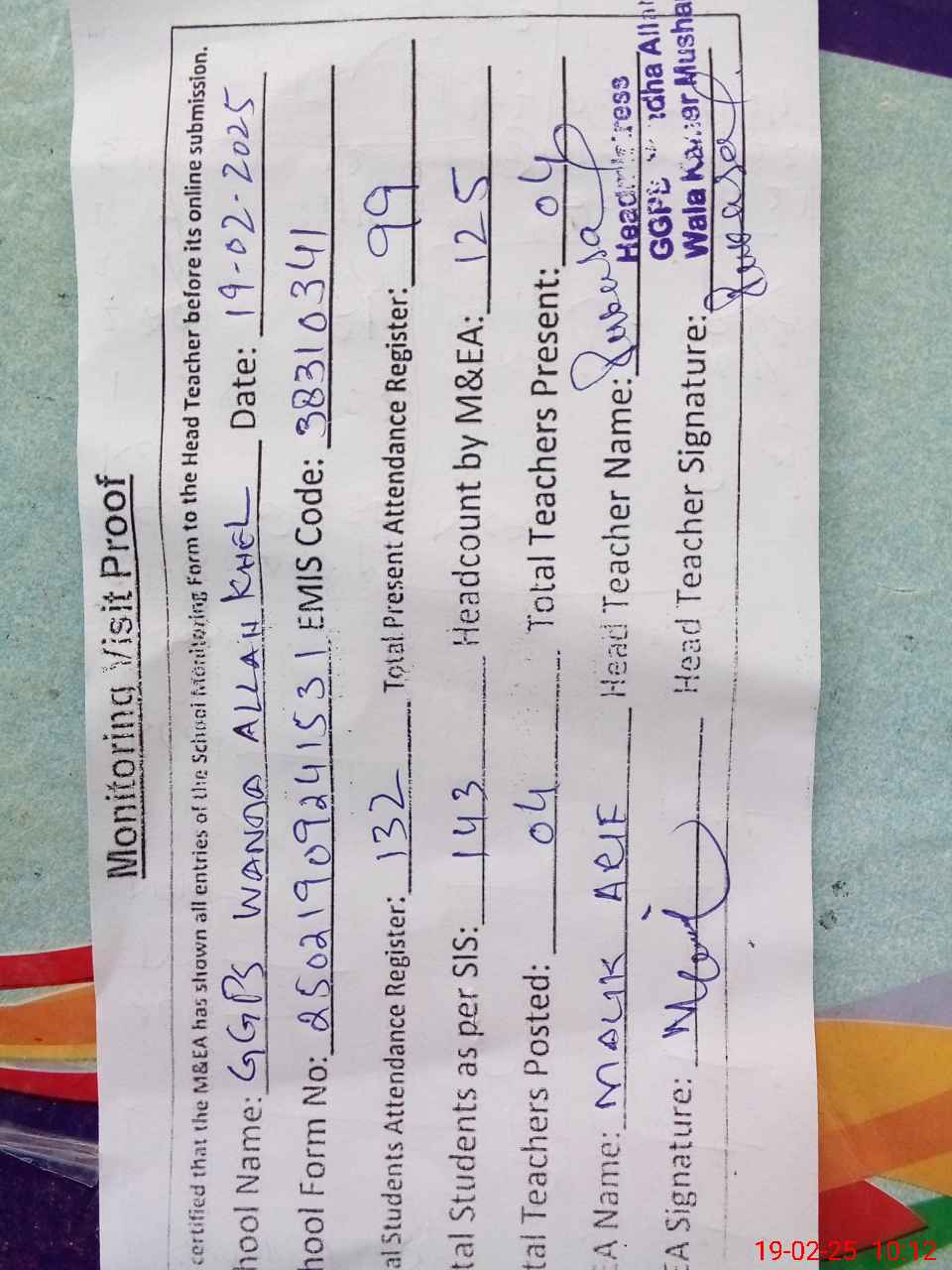 | Attendance Register | Head Teacher | MEA with School | Visit Proof |