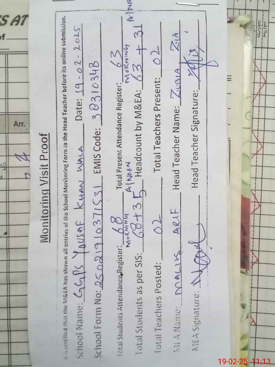 | Attendance Register | Head Teacher | MEA with School | Visit Proof |