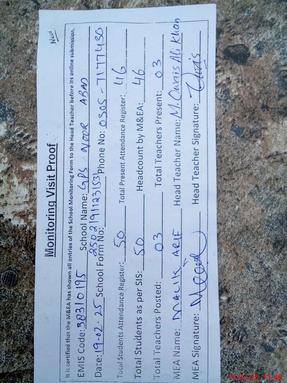 | Certified that this School was Inspected by the Undersigned MEA/DMO Today and the Information Stated Above is as Per Record. | |||||