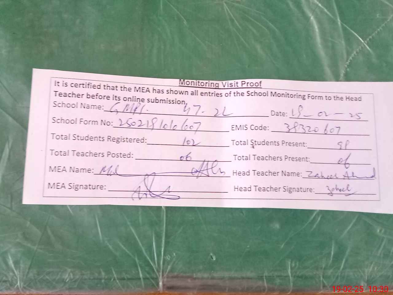 | Certified that this School was Inspected by the Undersigned MEA/DMO Today and the Information Stated Above is as Per Record. | |||||