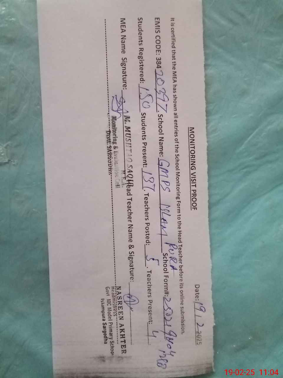| EMIS Code: 38420397 | Name of School: GMPS MC ISLAM PURA SARGODHA | |||
