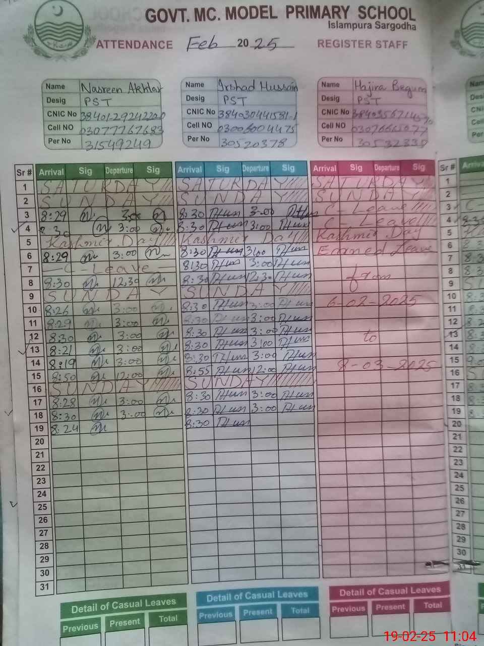 | CNIC | Full Name | Designation | R/C | Absence During Last Calender Month |