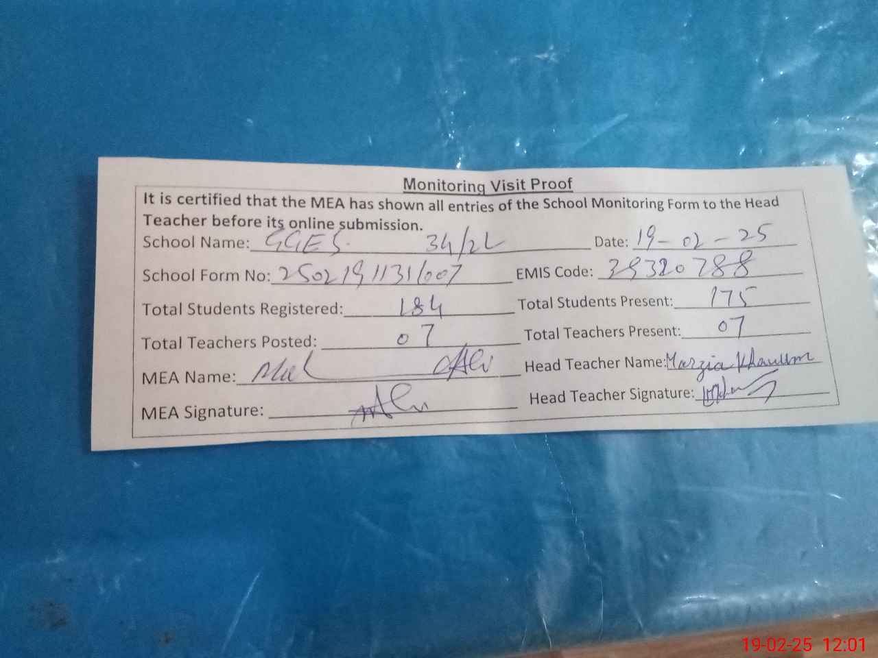 | Attendance Register | Head Teacher | MEA with School | Visit Proof |